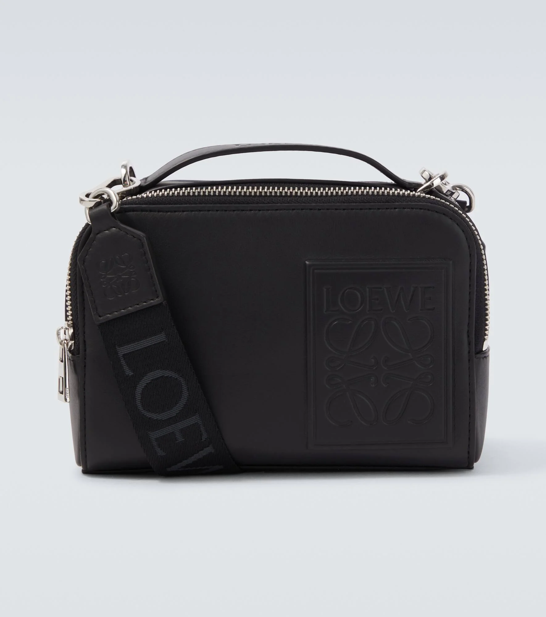 Show your brand love with versatile pieces like the Mini leather crossbody bag, featuring an oversized Anagram patch. All of Loewe's leather goods are handcrafted in Spain, reflecting the house's centuries-long expertise and artisanal methods. Product Details - Material: calf leather - Lining: fabric - Made in Portugal - Designer color name: Black - Item color: black - Hardware color: silver - Top handle, Detachable, adjustable shoulder strap - Internal details: two internal compartments - Closure: zipped top - Includes: dust bag - Item number: P01123379 Size & Fit - Height 12cm-4.5" - Width 18cm-7" - Depth 7cm-3" - Adjustable shoulder strap - Min. length shoulder strap 74cm-29" - Max. length shoulder strap 124cm-49"