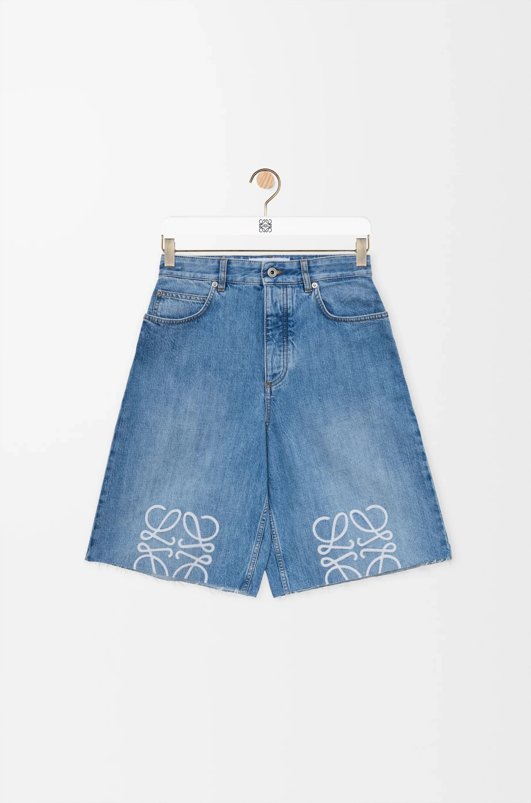 Shorts in lightweight washed cotton denim featuring Anagram cut-outs at the knees. - Regular fit, regular length - Mid waist - Concealed button fly - Five pocket style - Raw hem - LOEWE embossed leather patch placed at the back Colour: Washed Denim Main material: Cotton Weight: 0.55 kg Made in: Italy Materials & care Main Material: 100% cotton