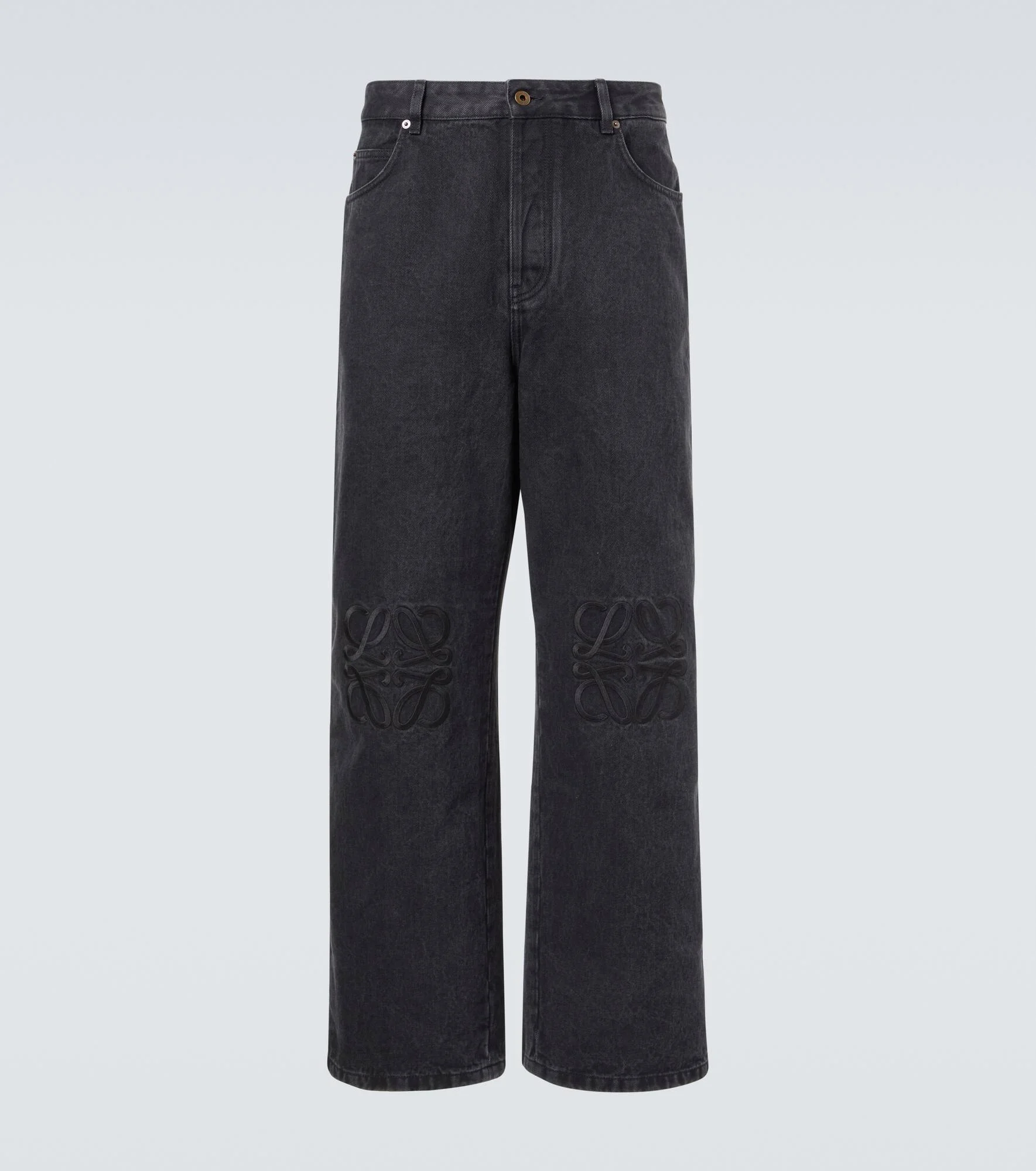These wide-leg jeans from Loewe are emblazoned with the brand's Anagram embroidery at the knees. The pair is made from denim in a black wash and has a high-rise silhouette with a baggy fit. Product Details - Material: 100% cotton - Care instructions: machine wash at 30 degrees - Made in Italy - Designer color name: Black - Item color: black - Details: 100% calf leather - Pocket lining: 65% polyester, 35% cotton - Embroidery: 100% polyester - Contains non-textile parts of animal origin - Belt loops - Pockets: five pockets - Closure: button fastening - Item number: P01130858 Size & Fit - True to size - Non-stretchy fabric - Wide-leg - High-rise - Height of model is 189cm-74.5" and wears a size 50