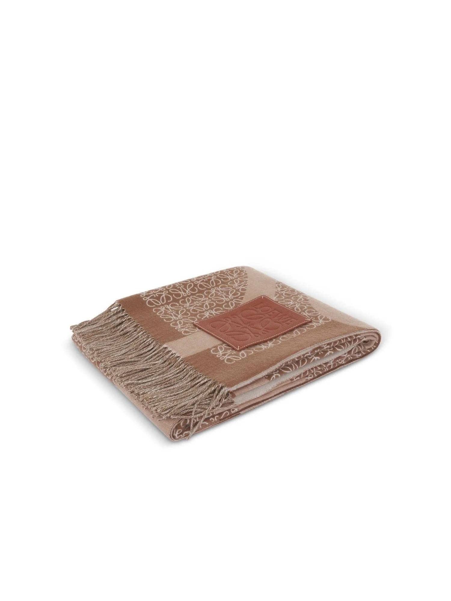 Anagram wool blanket in camel with repeat anagram pattern, contrast loewe l motif and embossed loewe anagram calfskin patch - Composition: 100% Mohair - Repeat Anagram pattern - Contrast LOEWE L motif - Fringed edges - Embossed LOEWE Anagram calfskin patch SKU: K000230X33 3150