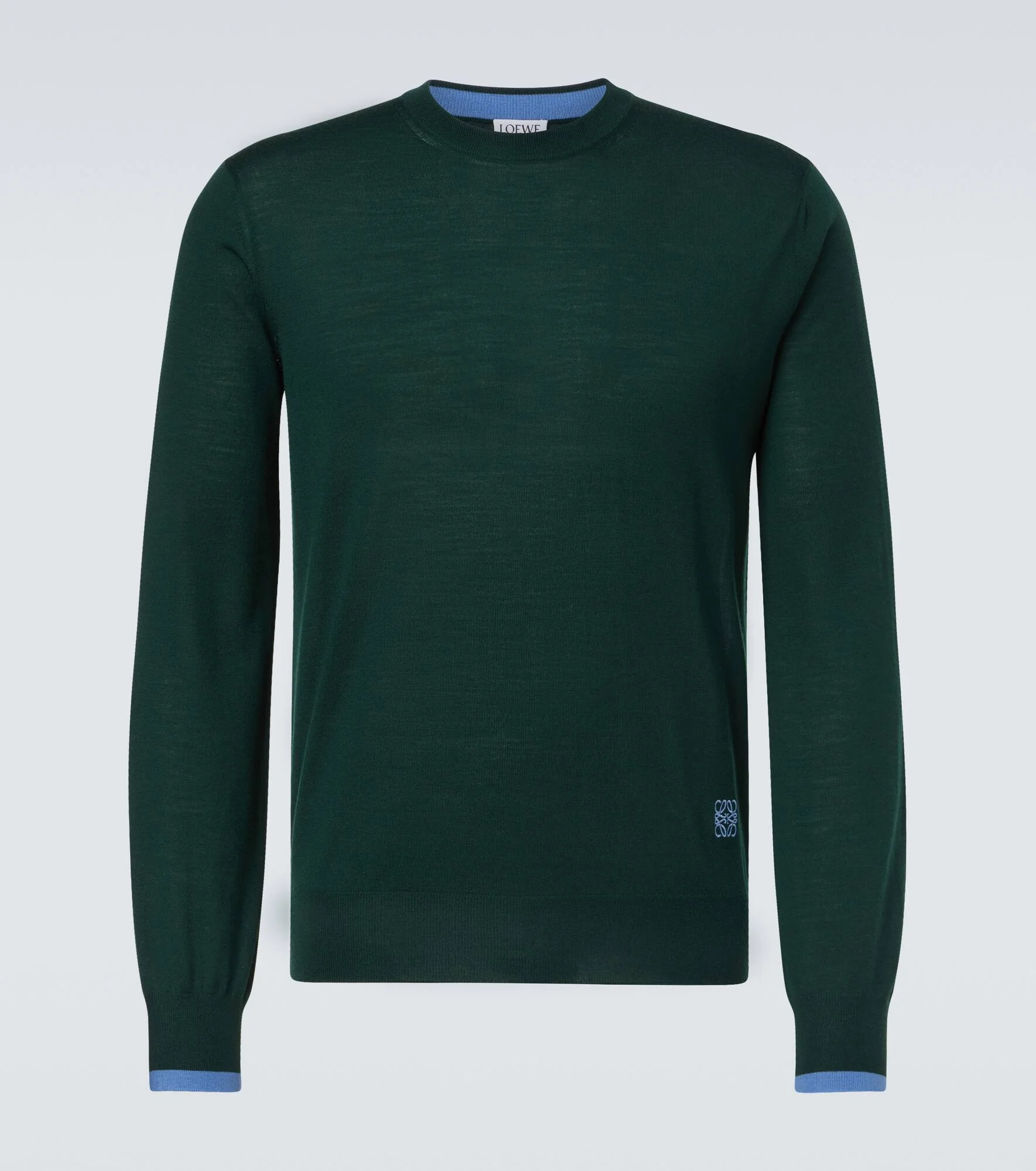 This sweater is crafted from soft wool to a regular fit, showcasing Loewe's signature Anagram embroidery in subtle detail. The design stands out with contrast ribbed-knit trims on the inside of the neck and cuffs. Product Details - Material: 100% wool - Care instructions: dry clean - Made in Italy - Designer color name: Green/Blue - Item color: green - Embroidery: 100% polyester - Collar: crewneck - Cuff: ribbed - Hem: ribbed - Item number: P01123312 Size & Fit - True to size - Straight fit - Stretchy fabric - Falls to the hip - Height of model is 189cm-74.5" and wears a size L