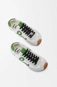 Sneaker in nylon and calfskin featuring a hand-finished Louis Wain cat lace charm, an asymmetrical toe shape, a sock-like internal structure and a lightweight rubber outsole that extends to the toecap. This sneaker is inspired by Louis Wain's "Futurist Cats" porcelain vase series. - 20mm heel - Comes with white and tonal laces - Shadow-effect L monogram at the side, embossed Anagram on the tongue - Injected rubber LOEWE on the heel tab Colour: White/Grass Green/Dark Orang Main material: Nylon/calf Weight: 0.8 kg Made in: Italy