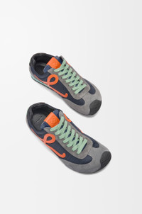 Sneaker in nylon and calfskin featuring an asymmetrical toe shape, a sock-like internal structure and a lightweight rubber outsole that extends to the toecap. - 20mm heel - Comes with white and tonal laces - L monogram at the side, embossed Anagram on the tongue - Injected rubber LOEWE on the heel tab Details - Colour : Navy/Orange/Turquoise - Main material : Nylon/Calf - Heel height : 2 - Weight : 1.0 kg - Model ID : M816282XB3 - Made in : Italy
