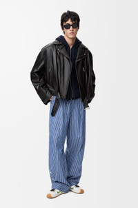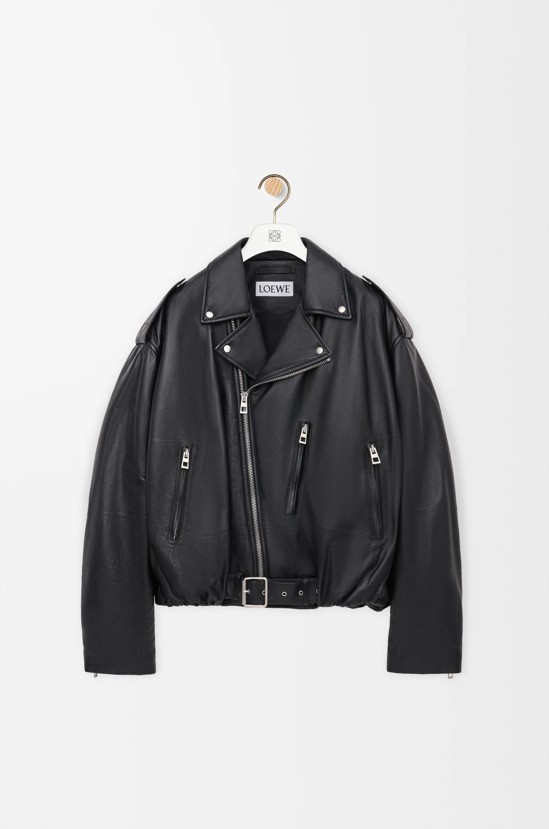 Jacket in super lightweight nappa lambskin featuring a padded construction on a balloon-shaped biker silhouette. - Regular fit, regular length - Zip front fastening, zipped cuffs - Zipped pockets - Buckle belt at the hem - Fully lined - LOEWE Anagram embossed leather patch placed at the back Colour: Black Main material: Nappa Weight: 0.79 kg Made in: Italy Materials & care Main Material: 100% lambskin