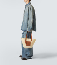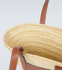 Displaying Loewe's penchant for artisanal design, this basket bag has been crafted in Spain featuring a hand-woven raffia body, tan leather top handles, and an embossed leather Anagram patch. Product Details - Made in Spain - Material: fabric - Designer color name: Natural/Tan - Internal details: fabric lining - Comes with dust bag - Trim: leather - Adjustable shoulder straps - Closure: open top - Item number: P00476634 Size & Fit - Height 24cm-9.5" - Width 43cm-17" - Depth 30cm-12" - Min. length of handles 42cm-16.5" - Max. length of handles 48cm-19"