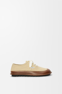 Two-tone lace-up shoes in canvas and vegetable-tanned calfskin featuring a flexible and lightweight construction with the LOEWE signature asymmetric bulky toe shape and contrast topstitching. - Lace closure - TPU outsole with enhanced grip - LOEWE fabric tab at the side Details - Colour : Beige/Brown - Main material : Canvas/Calf - Heel height : 1.5 - Weight : 1.0 kg - Model ID : M816282XBC - Made in : Italy