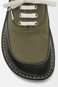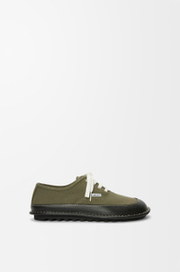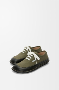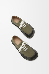 Two-tone lace-up shoes in canvas and vegetable-tanned calfskin featuring a flexible and lightweight construction with the LOEWE signature asymmetric bulky toe shape and contrast topstitching. - Lace closure - TPU outsole with enhanced grip - LOEWE fabric tab at the side Details - Colour : Khaki Green/Black - Main material : Canvas/Calf - Heel height : 1.5 - Weight : 1.0 kg - Model ID : M816282XBC - Made in : Italy