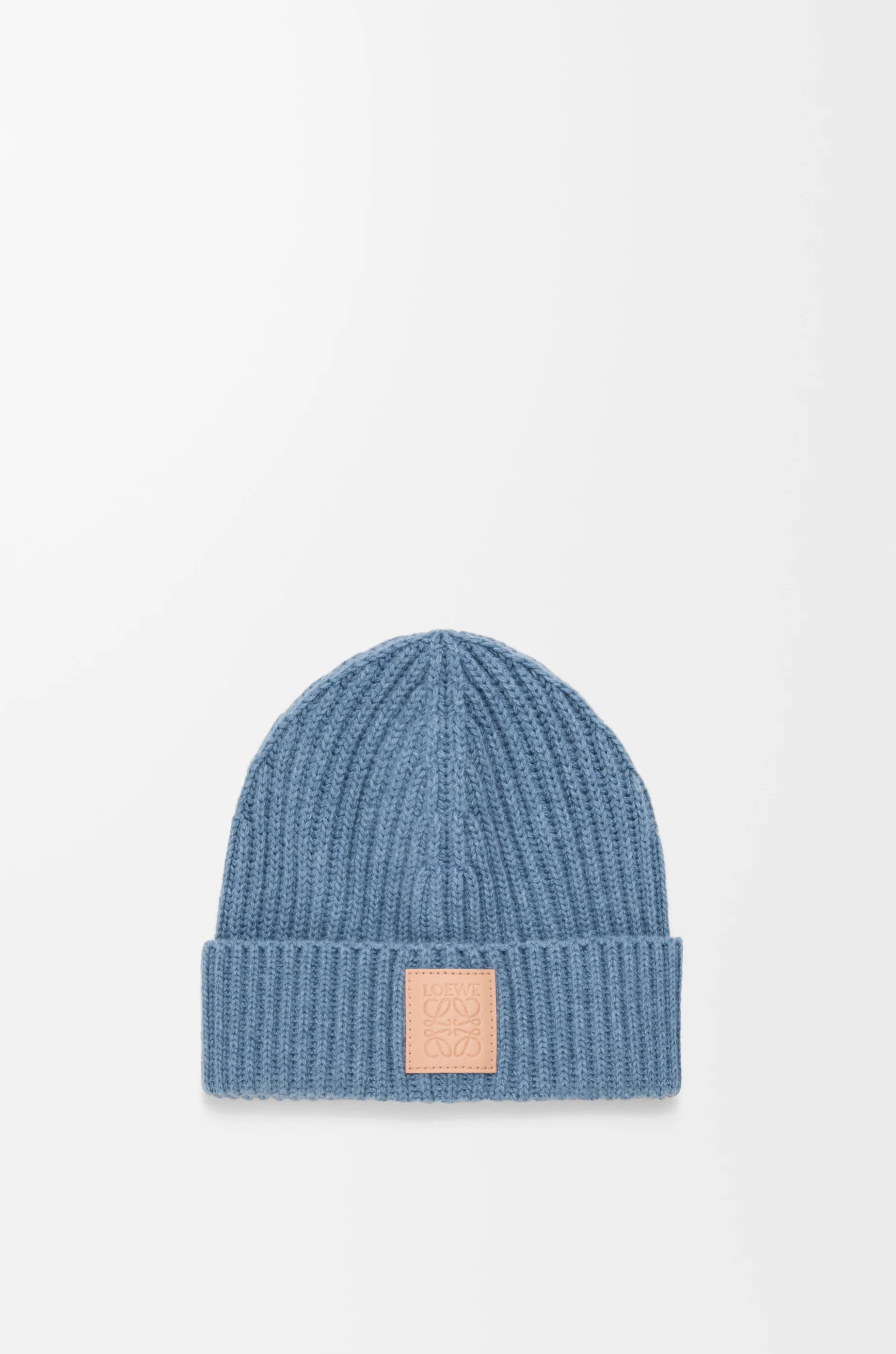 Beanie crafted in ribbed cashmere knit. - Short length - Turn-up cuff - LOEWE leather patch placed at the front Colour: Denim Blue Main material: Cashmere Weight: 0.068 kg Made in: Italy