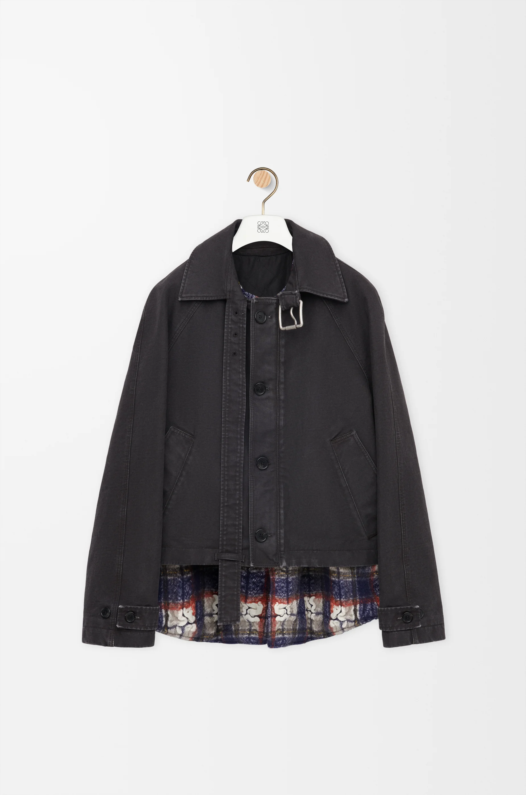Jacket in medium-weight garment-dyed cotton twill featuring a layered construction with a detachable boiled wool check vest. - Regular fit, regular length - Classic collar with adjustable buckle strap - Button and concealed zip front fastening - Cuffs tabs - Buttoned diagonal flap pockets, inside welt pocket - Fully lined, quilted lining on the vest - LOEWE Anagram embossed leather patch placed at the back Colour: Anthracite Main material: Cotton Weight: 1.13 kg Made in: Italy Materials & care Main Material: 59% wool 41% linen