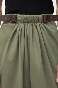 Trousers in medium-weight garment-dyed cotton satin featuring a gathered front with a decorative contrast belt. - Regular fit, regular length - Mid waist, straight leg - Side zip fastening - Seam pockets, buttoned rear jet pocket - Pressed creases at the front - LOEWE embossed leather patch placed at the back Colour: Khaki Green Main material: Cotton Weight: 0.8 kg Made in: Italy Materials & care Main Material: 100% cotton