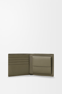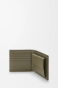 Bifold coin wallet in satin calfskin. - Four card slots, two large note pockets, one flat pocket - One coin compartment with snap button closure - Calfskin lining - Debossed LOEWE Anagram patch Colour: Khaki Green Metallic colour: Palladium Main material: Satin calf Weight: 0.1 kg Height: 9.8 cm Width: 11 cm Depth: 2 cm Made in: Spain