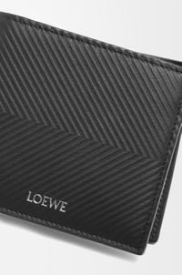 Bifold coin wallet in classic calfskin embossed with a chevron pattern. - Four card slots, two large note pockets - One coin compartment with snap button closure - Calfskin lining - Silver embossed LOEWE Details - Colour : Black - Metallic colour : Palladium - Main material : Classic Calf - Weight : 0.08 kg - Height (cm) : 9.8 - Width (cm) : 11 - Depth (cm) : 2 - Height (inch) : 3.9 - Width (inch) : 4.3 - Depth (inch) : 0.8 - Model ID : C779501X01 - CIL : - 0011208550 - Made in : Spain