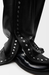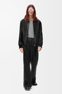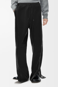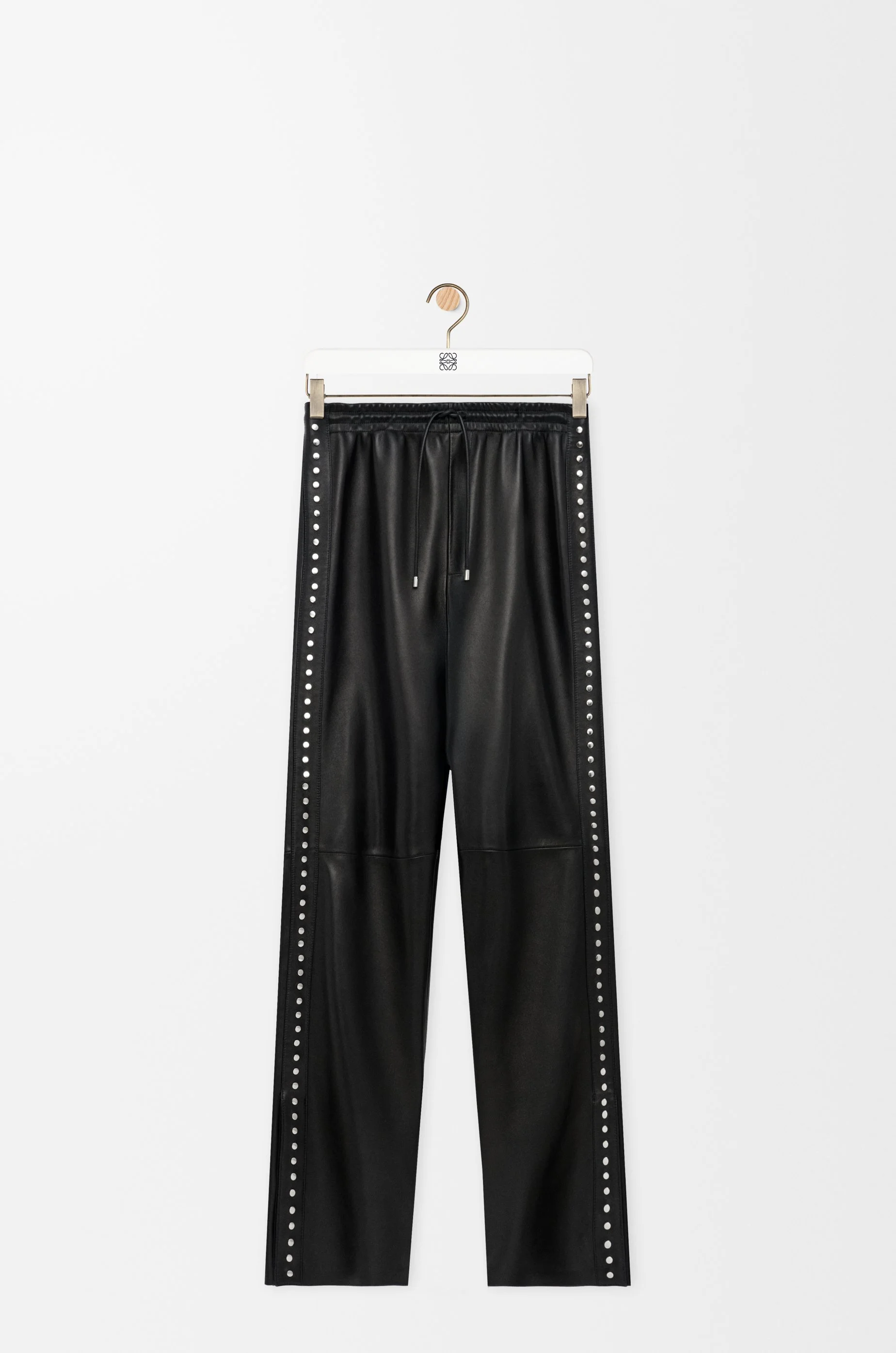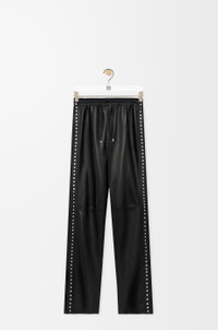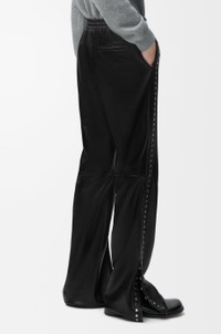 Trousers in lightweight nappa lambskin featuring studs at the sides and a split hem with snap button fastening. - Relaxed fit, regular length - Mid waist, straight leg - Elasticated waistband with drawstring - Seam pockets, zipped rear jet pocket - Embossed Anagram placed at the back Colour: Black Main material: Nappa Weight: 1.5 kg Made in: Spain Materials & care Main Material: 100% lambskin