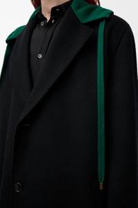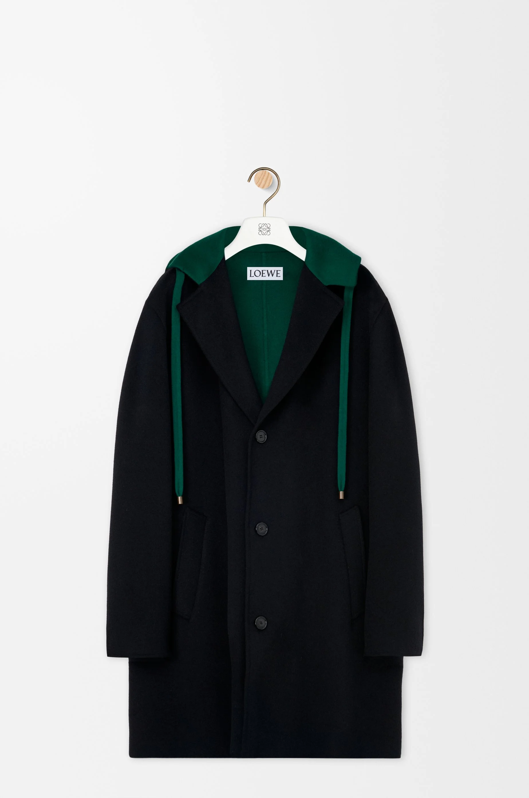 Coat in lightweight bicolor wool and cashmere. - Regular fit, long length - Hooded collar - Button front fastening - Welt pockets - Back vent - LOEWE Anagram embossed leather patch placed on the hood Colour: Black/Green Main material: Virgin Wool/Cashemere Weight: 1.0 kg Made in: Italy Materials & care Main Material: 90% wool 10% cashmere