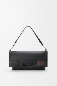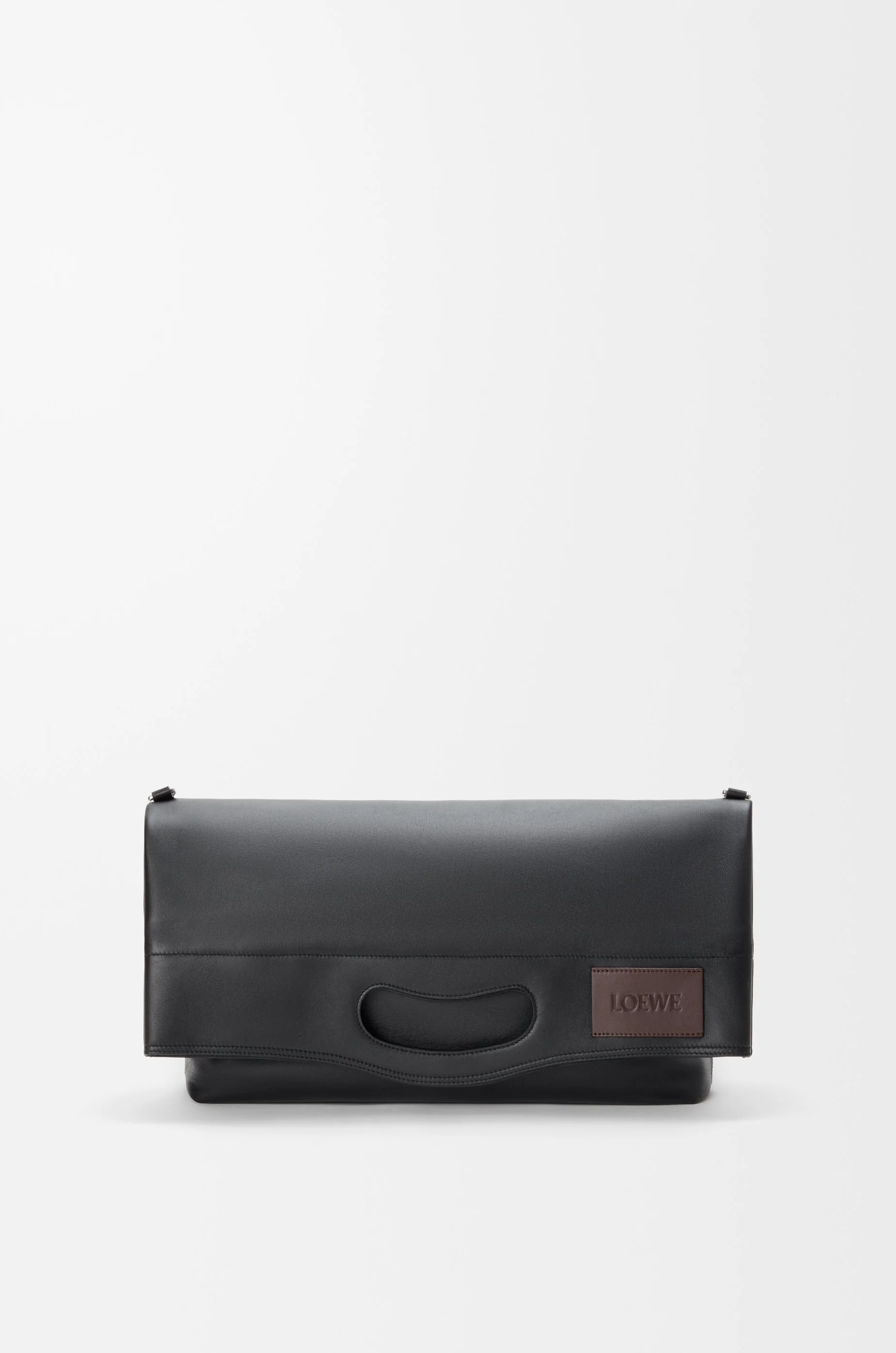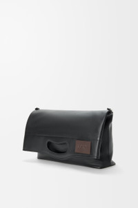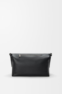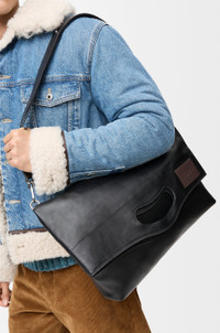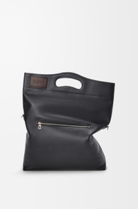 The Bob folded tote offers a versatile reinterpretation of the Bobby shoe line, defined by a distinctive handle-shaped cut-out. Its modular design allows for a range of carry options as a tote, clutch or crossbody bag. This version is crafted in shiny supple calfskin. - Shoulder, crossbody or hand carry - Detachable and adjustable strap - Zip closure - One external zip rear pocket, one internal zip pocket - Textile lining - LOEWE embossed calfskin patch Colour: Black Metallic colour: Palladium Main material: Shiny supple calf Strap length: 84 - 135 cm Strap drop: 35 - 65 cm Handle drop: 4 cm Weight: 0.89 kg Height: 47.5 cm Width: 38 cm Depth: 9.5 cm Made in: Spain