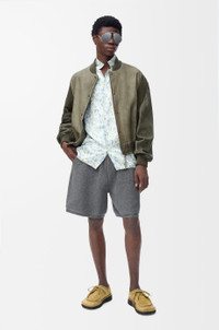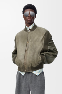 Jacket in lightweight vintage-effect nappa lambskin featuring a rib knit collar, armholes, cuffs and hem. - Relaxed fit, regular length - Concealed snap button and zip front fastening - Buttoned welt pockets, inside welt pocket - Fully lined - Embossed Anagram placed on the chest. LOEWE Anagram embossed leather patch placed at the back Colour: Khaki Green Main material: Nappa Weight: 1.63 kg Made in: Italy Materials & care Main Material: 100% lambskin