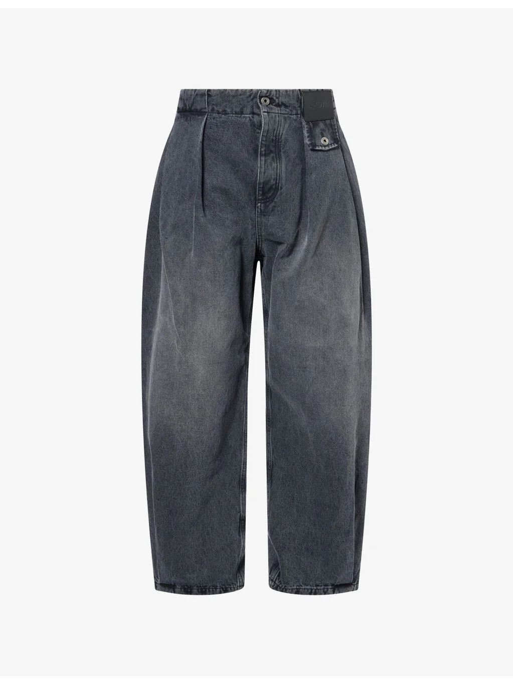 PRODUCT DETAILS - Loewe denim jeans - 100% cotton; embellishments 100% calf leather; pocketlining 65% polyester, 35% cotton - Exposed button and concealed button-fly fastening at front - Relaxed fit, high-rise, barrel leg, belt loops, two slip pockets and pleated at front, buttoned pocket and brand patch at front, patch pocket at back, faded wash and whiskering - Dry clean - Made in Italy - Size UK 32: rise 15in / 39cm, inside leg 29in / 75cm, leg opening 18in / 46cm - Model is 6ft 2in/1.88m and wears a size UK 32 - Midweight, slight stretch Ref: R04565729