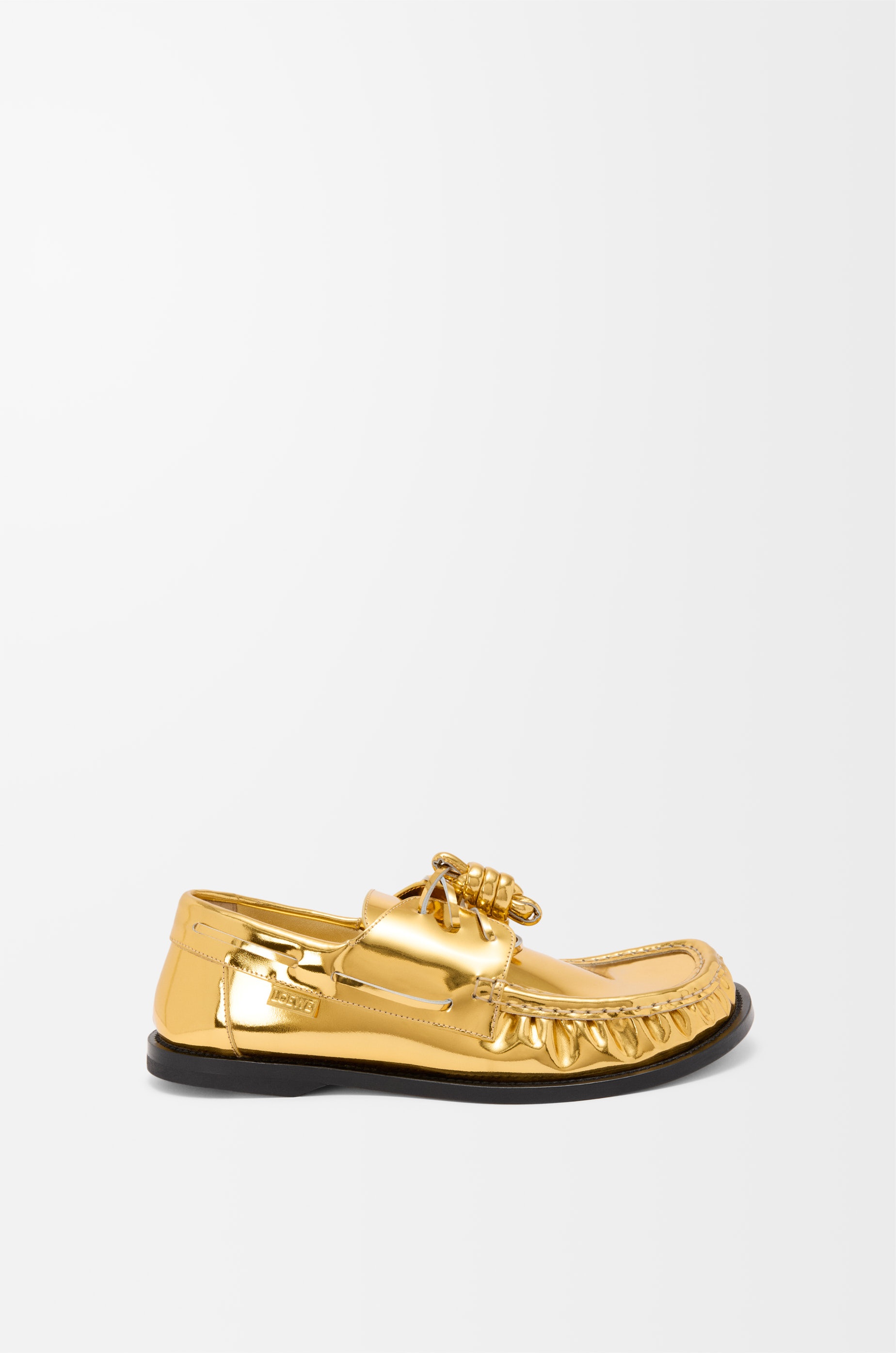 Boat shoe in metallic calfskin featuring the LOEWE signature round toe shape and a hand-sewn construction with a supple leather lining and flexible sole. - 20mm heel - Squared leather lace closure - Padded leather insole - Rubber-injected leather outsole - Removable Flamenco knot - LOEWE embossed tag placed at the side Details - Colour : Gold - Main material : Metallic Calf - Heel height : 1 - Weight : 0.9 kg - Model ID : MLSCS08X01 - Made in : Italy