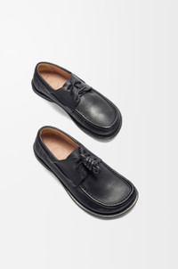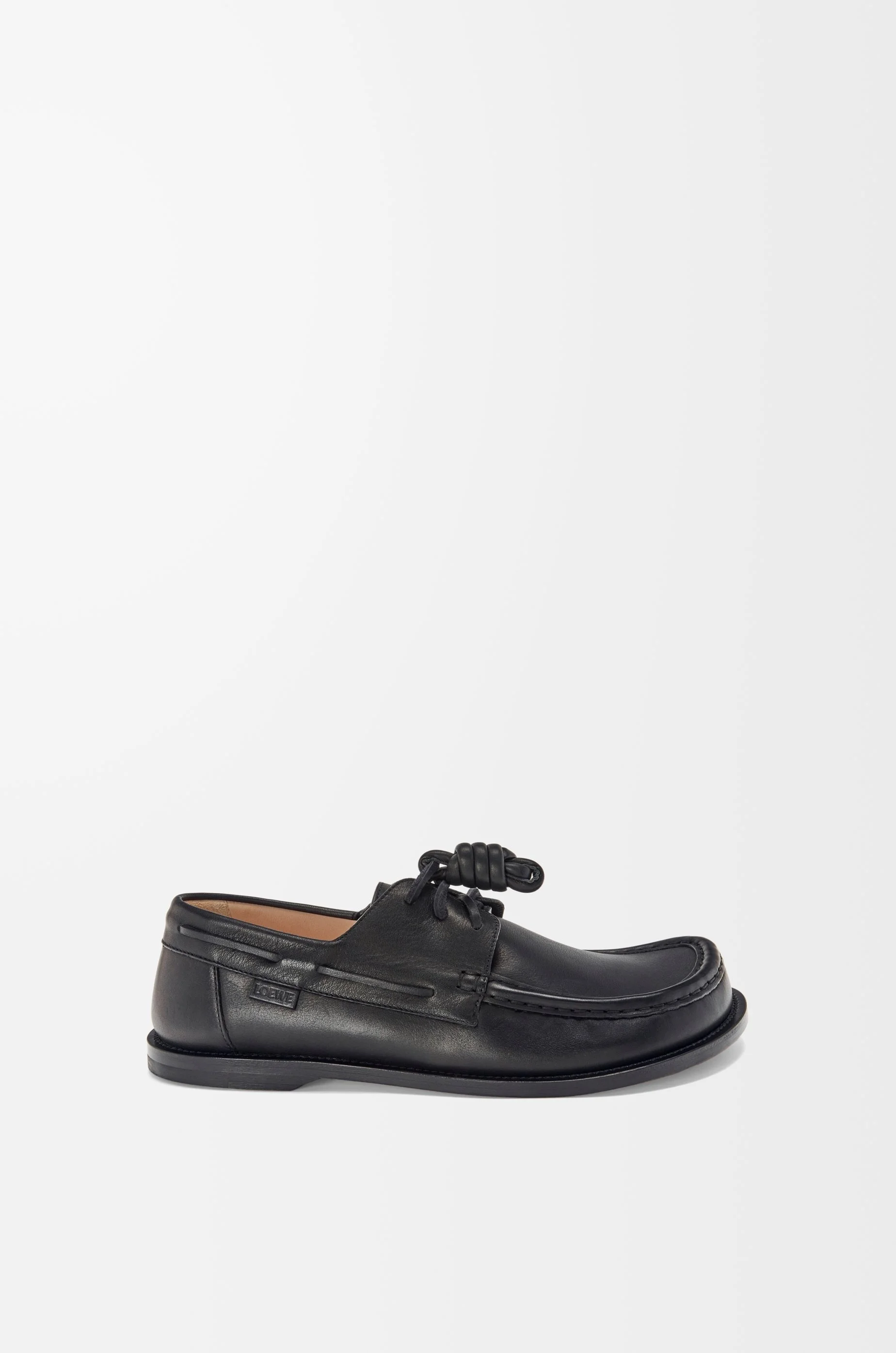 Boat shoe in two-tone soft calfskin featuring the LOEWE signature round toe shape and a hand-sewn construction with a supple leather lining and flexible sole. - 20mm heel - Squared leather lace closure - Padded leather insole - Rubber-injected leather outsole - Removable Flamenco knot - LOEWE embossed tag placed at the side Details - Colour : Black - Main material : Soft Calf - Heel height : 1 - Weight : 0.9 kg - Model ID : M816290X45 - Made in : Italy