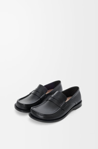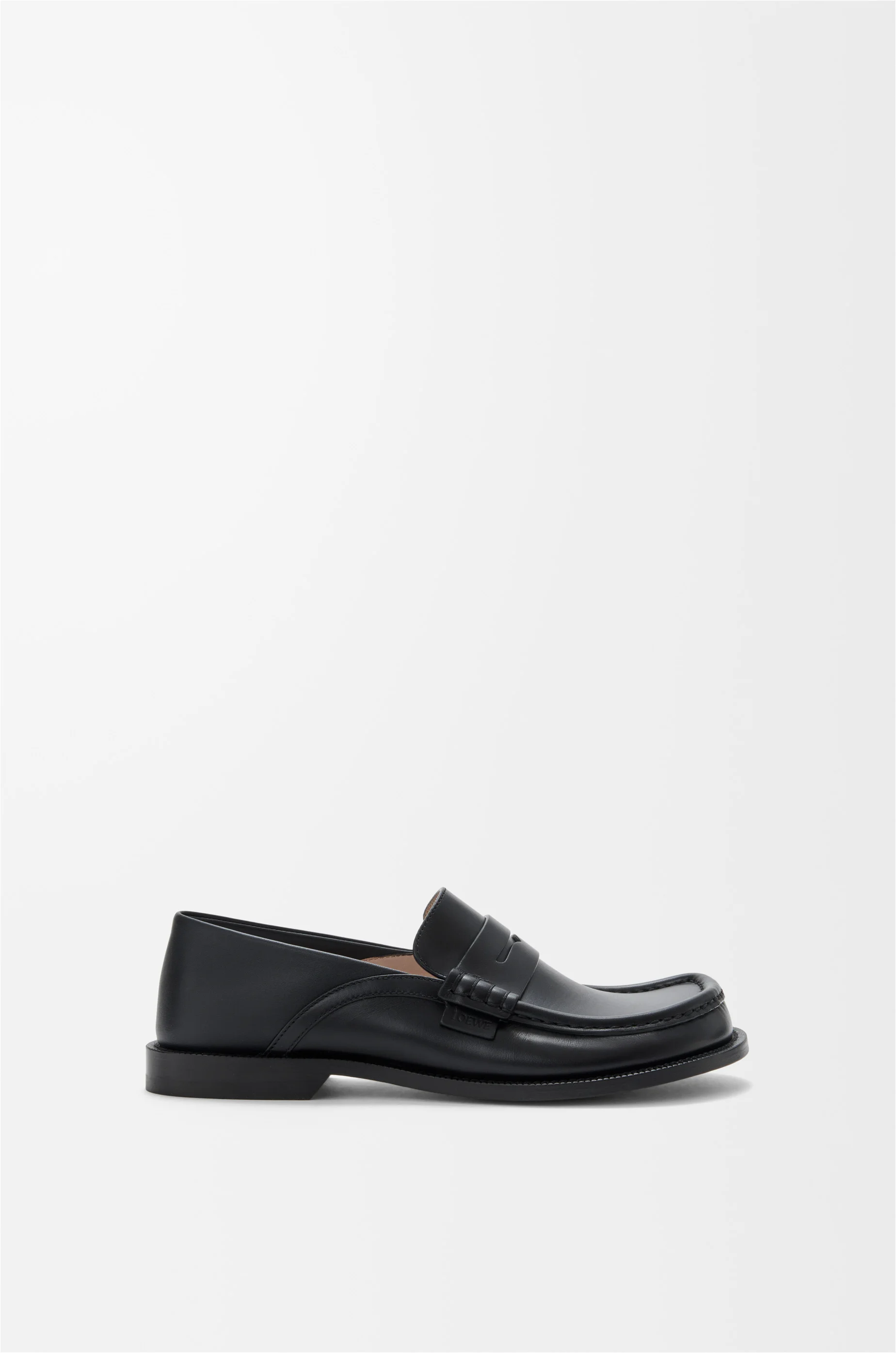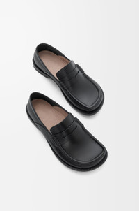 Loafer in waxy calfskin featuring the signature round asymmetrical toe shape and a soft collapsible back in nappa lambskin to allow multiple ways to wear. - 20mm heel - LOEWE embossed tab at the side - Padded leather insole, leather outsole - Rubber-injected island on the outsole Colour: Black Main material: Waxy Calf Weight: 0.8 kg Made in: Italy