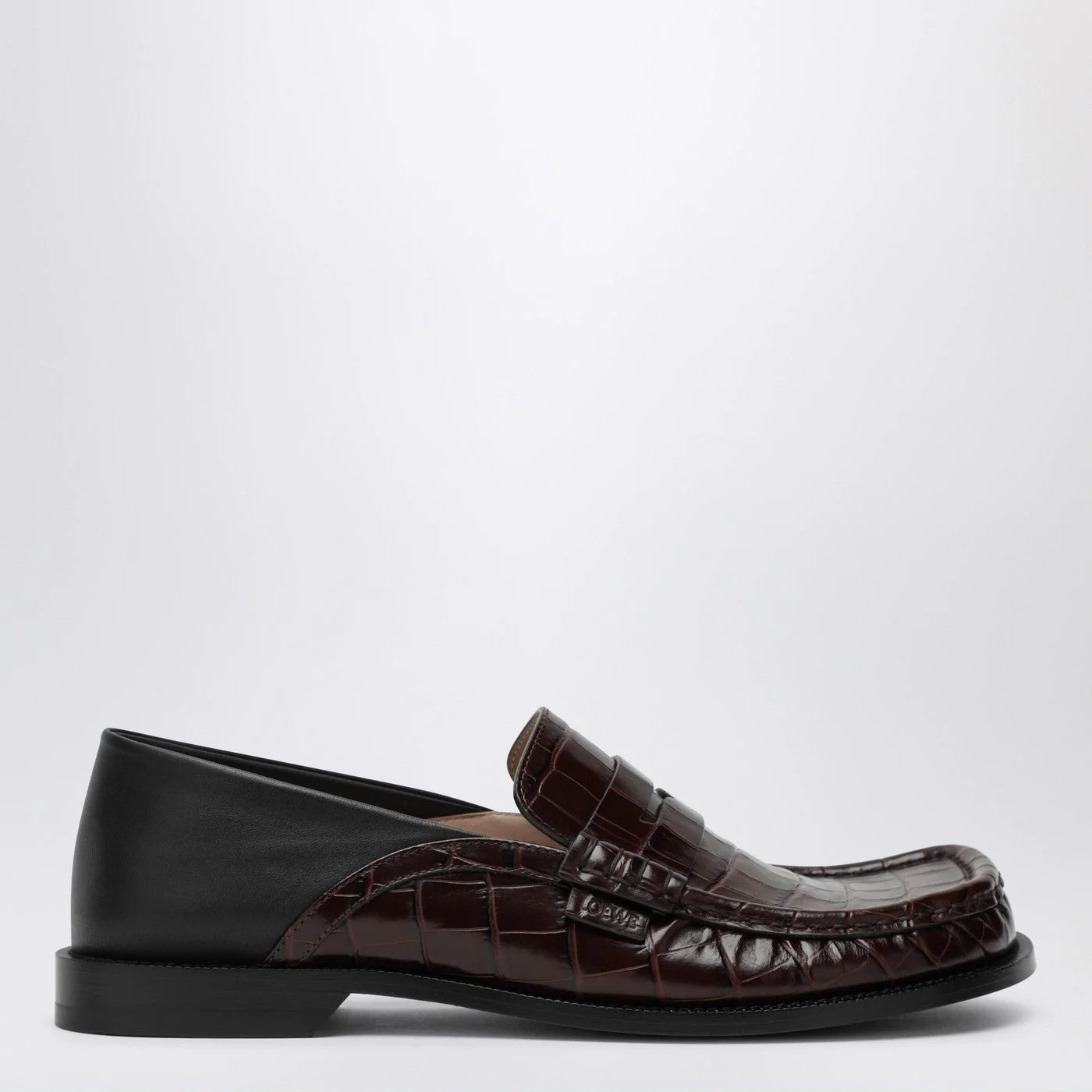 Loewe loafers in brown crocodile-effect grained leather and black smooth leather featuring asymmetrical round toe foldable back side tongue with embossed logo lettering padded leather insole and leather sole.