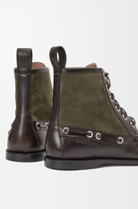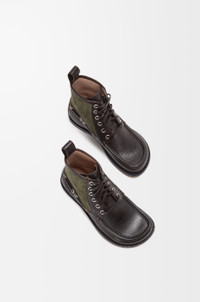 Bootie in calfskin with contrast suede inserts inspired by the Campo boat shoe with the signature round asymmetrical toe shape and a hand-sewn construction with a supple leather lining. - 10mm heel height - Square lace closure - LOEWE embossed label at the side - Padded leather insole, leather outsole - Rubber-injected island on the outsole Colour: Dark Brown/Green Main material: Calf/Suede Weight: 1.0 kg Made in: Italy