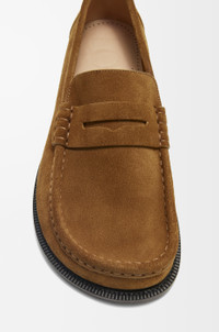 Loafer crafted in brushed suede featuring the LOEWE signature round asymmetrical toe shape. Key details include a high vamp and hand stitching. - Leather outsole and insole Details - Colour: Tabacco - Main material: Calf Suede - Heel height: 2 - Weight: 0.9 kg - Model ID: M816290X14 - Made in: Italy