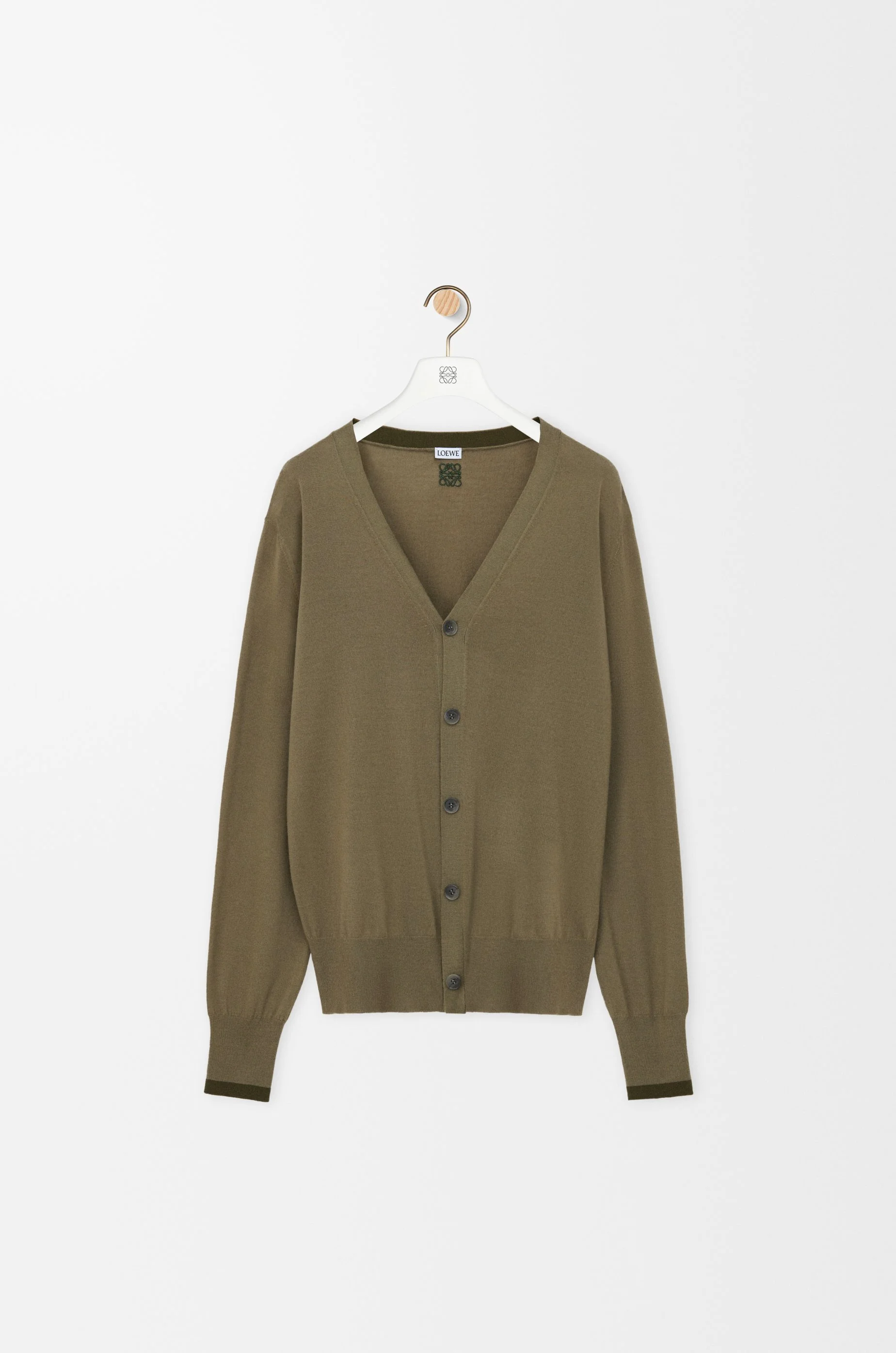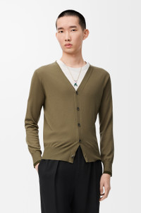 Cardigan in lightweight fine wool featuring contrast rib details at the inside collar, placket and cuffs. - Regular fit, regular length - Jersey stitch - V neck - Button front fastening - Ribbed cuffs and hem - Contrast Anagram embroidery placed at the back Colour: Green/Khaki Green Main material: Wool Weight: 0.19 kg Made in: Italy Materials & care Main Material: 100% wool