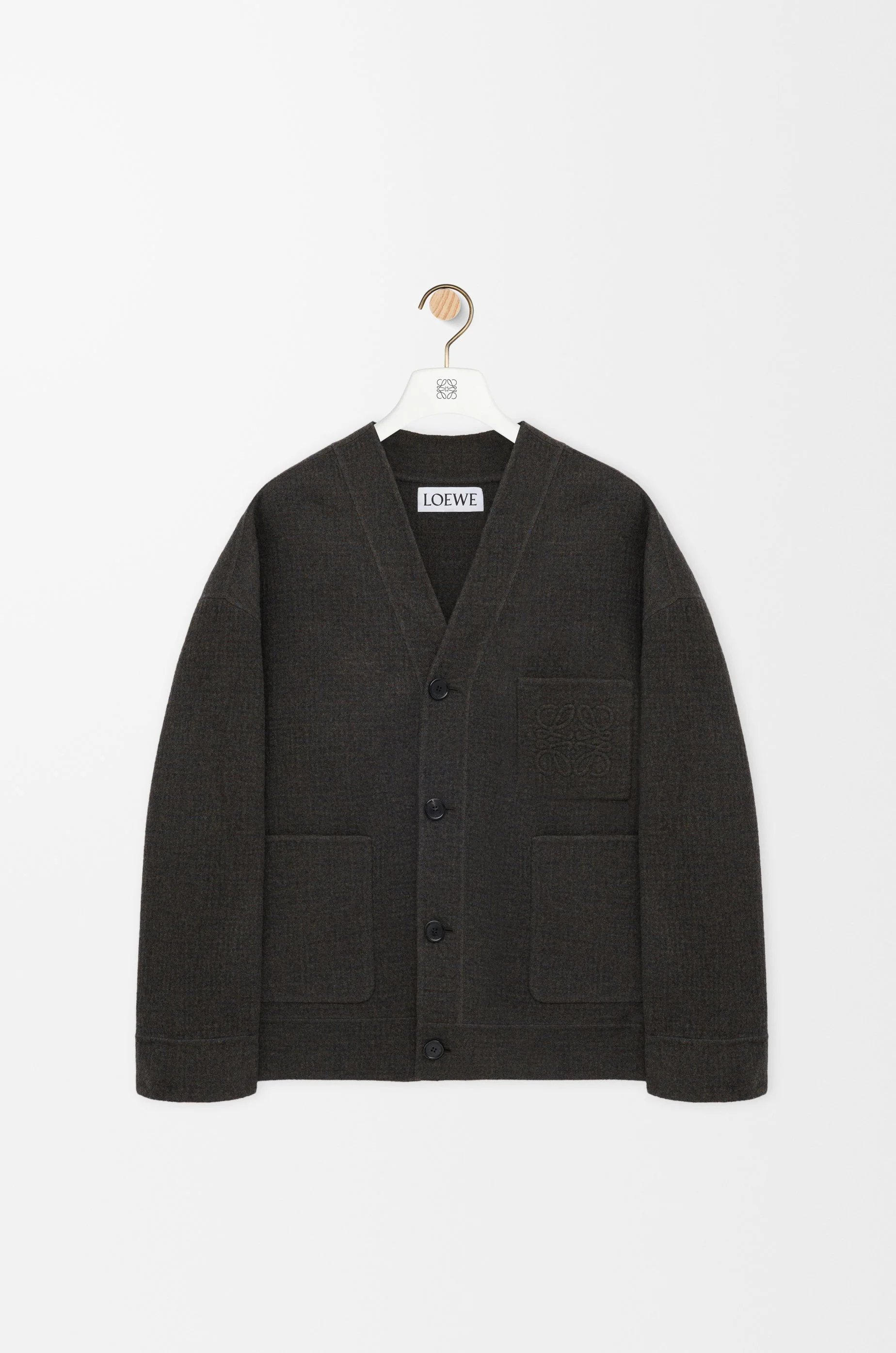 Cardigan in medium-weight boiled double face boiled wool and silk. - Regular fit, regular length - V-neck - Button front fastening - Chest patch pocket, patch pockets, inside LOEWE Anagram leather patch pocket - 3D Anagram embroidery placed on the chest pocket Colour: Khaki Brown/Blue Main material: Wool/silk Weight: 0.81 kg Made in: Italy Materials & care Main Material: 99% wool 1% silk