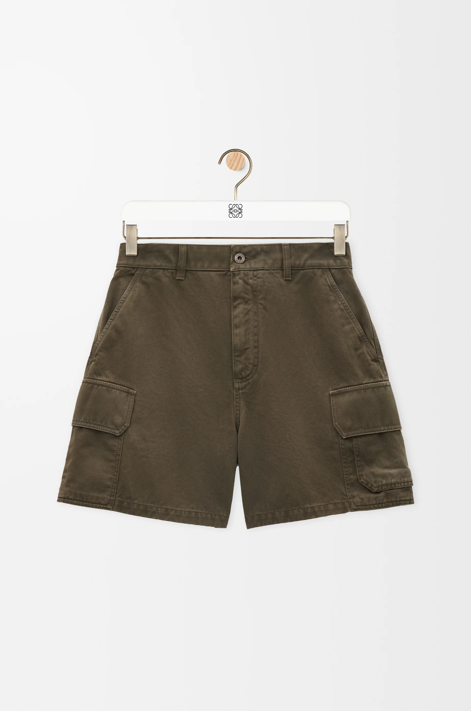 Shorts in medium-weight garment-dyed cotton twill featuring cargo pockets and a buttoned rear flap pocket with a trompe l’oeil outline. - Regular fit, regular length - Concealed zip fly - Slash pockets - LOEWE embossed leather patch placed at the back Details - Colour : Khaki Green - Main material : Cotton - Weight : 0.8 kg - Model ID : H526Y1AW05 - Made in : Italy