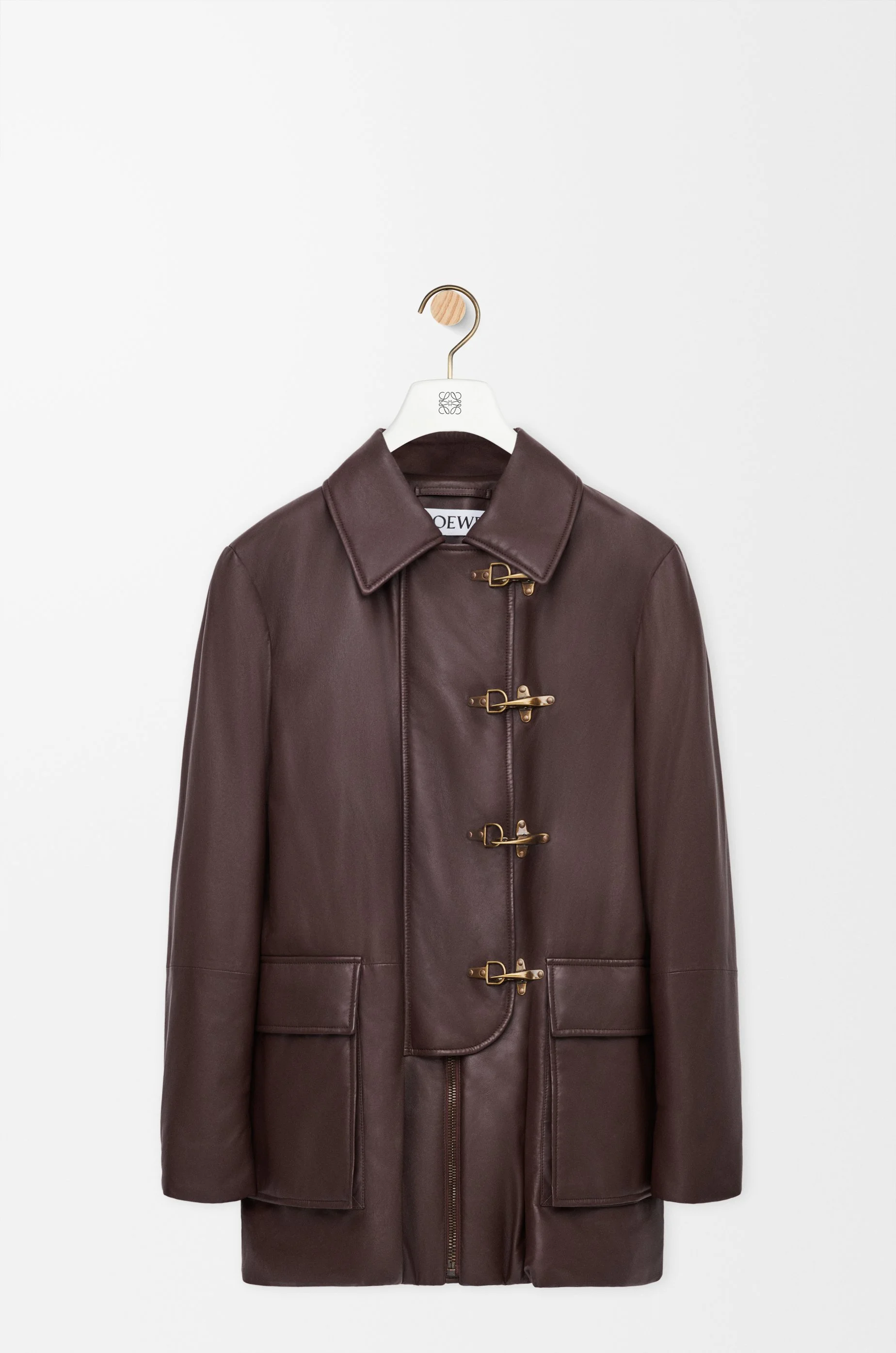 Coat in lightweight nappa lambskin featuring light padding. - Regular fit, short length - Classic collar - Concealed zip front and clasp fastening - Gusset pockets - Fully lined - LOEWE Anagram embossed patch placed at the back Colour: Chocolate Brown Main material: Nappa Weight: 1.5 kg Made in: Italy Materials & care Main Material: 100% lambskin
