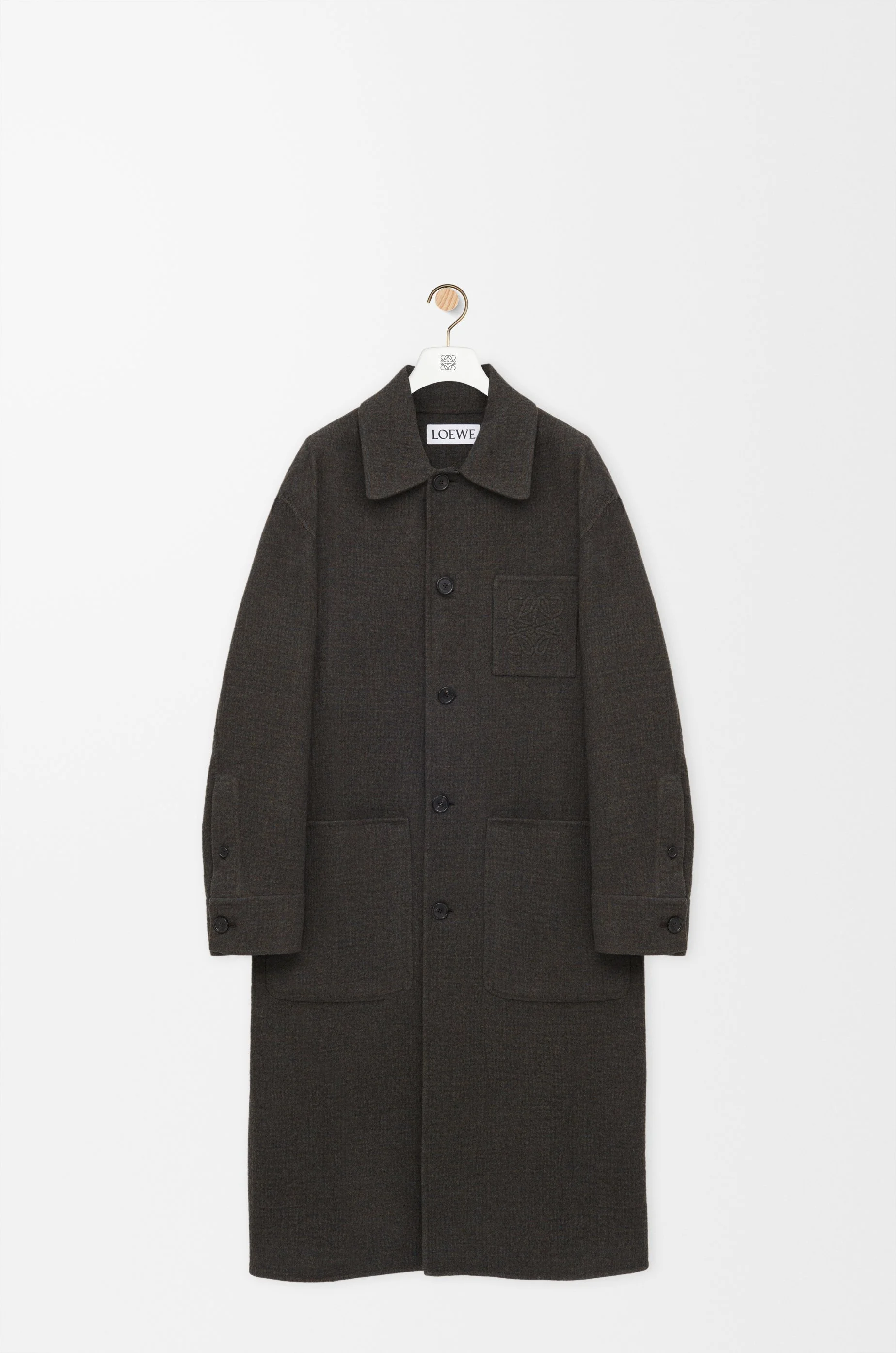 Coat in medium-weight boiled double face boiled wool and silk featuring a single-breasted construction. - Regular fit, regular length - Classic collar - Button front fastening, buttoned cuffs - Chest patch pocket, patch pockets, inside patch pocket - Back vent - 3D Anagram embroidery placed on the chest pocket Colour: Khaki Brown/Blue Main material: Wool/silk Weight: 1.12 kg Made in: Italy Materials & care Main Material: 99% wool 1% silk