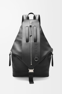 The Convertible backpack is a high-comfort functional bag with a buckle that unclips to convert it into a holdall and a large external zipped pocket that fits a tablet. This version is crafted in classic calfskin with a mesh back. - Suitable for a 13 inch laptop - Back, shoulder or hand carry - Top handle, adjustable padded shoulder straps - Zip closure with calfskin pull - One large external zipped pocket, two zipped side pockets - Herringbone cotton canvas lining - Embossed LOEWE with D-ring Colour: Black Metallic colour: Palladium Main material: Classic Calf Strap length: 52 - 90 cm Strap drop: 8 - 36 cm Handle drop: 6 cm Weight: 1.33 kg Height: 50 cm Width: 40 cm Depth: 20 cm Made in: Portugal