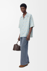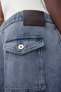 Trousers in lightweight washed cotton and linen canvas featuring an elasticated drawstring waist and pleats at the front. - Relaxed fit, regular length - Mid waist, straight leg - Concealed button fly - Seam pockets, buttoned rear flap pocket - LOEWE embossed leather patch placed at the back Colour: Grey Blue Main material: Cotton/Linen Weight: 0.65 kg Made in: Italy Materials & care Main Material: 79% cotton 21% linen