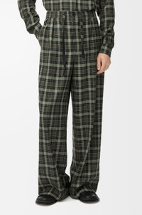 Trousers in lightweight wool blend tartan featuring an elasticated drawstring waist and a pleated front. - Relaxed fit, regular length - Mid waist, straight leg - Concealed button fly - Seam pockets, buttoned rear welt pocket - Anagram embroidery placed at the front, LOEWE embossed leather patch placed at the back Colour: Khaki/Black Main material: Polyester/Wool Weight: 0.5 kg Made in: Italy Materials & care Main Material: 55% polyester 45% wool