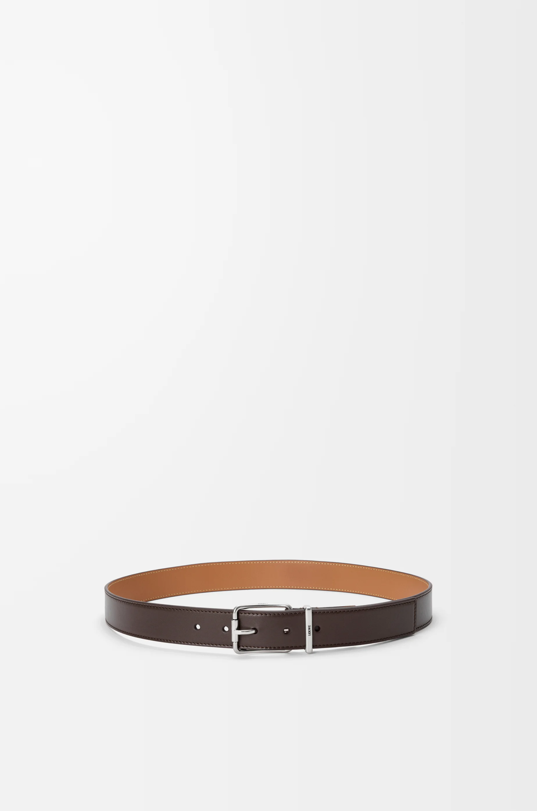 Belt in shiny sleek calfskin with a square buckle and a LOEWE engraved metallic loop. - 3.2cm wide - Five holes regulation Colour: Dark Cigar/Vintage Palladium Metallic colour: Palladium Main material: Shiny sleek calf Weight: 0.11 kg Depth: 3.2 cm Made in: Spain