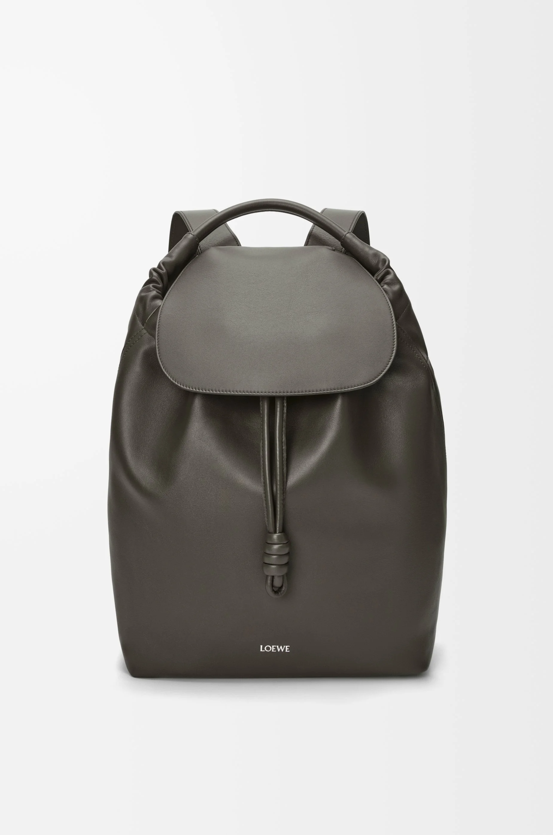 The Flamenco backpack is a streamlined design with a nod to the original bag's signature coiled knot detail. This version is crafted in shiny supple calfskin. - Suitable for a 13 inch laptop - Back, shoulder or hand carry - Adjustable leather and LOEWE webbing shoulder straps - Drawstring closure - One external zipped pocket, one internal slip pocket - Herringbone cotton canvas lining Details - Colour : Dark Grey - Metallic colour : Palladium - Main material : Shiny Supple Calf - Strap length : 46 - 66 cm - Handle drop : 7 cm - Weight : 0.8 kg - Height (cm) : 40 - Width (cm) : 36 - Depth (cm) : 16 - Height (inch) : 15.7 - Width (inch) : 14.2 - Depth (inch) : 6.3 - Model ID : B411FLKX01 - CIL : - 0011192077 - Made in : Spain