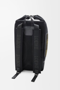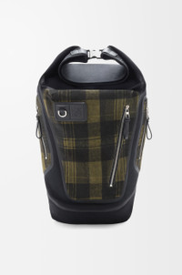 The Flex roll-top backpack is a multifunctional and versatile design defined by a trapeze silhouette in lightweight, water-resistant materials elevated by refined technical details. This version is crafted in cotton canvas and tartan-printed brushed suede. - Back, shoulder or top handle carry - Adjustable padded LOEWE webbing shoulder straps, leather top handle - Roll-top closure with snap buckles - Multiple compartments - One front zipped pocket, two side zipped pockets, one internal laptop pocket - Water-resistant nylon lining - Embossed Anagram with D-ring Colour: Khaki/Black Metallic colour: Palladium Main material: Canvas/Brushed Suede Strap length: 50 - 86 cm Handle drop: 8 cm Weight: 1.2555 kg Height: 60 cm Width: 42 cm Depth: 21 cm Made in: Portugal