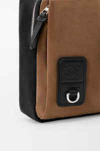 The Flex sling is a functional body bag with practical everyday proportions, complemented by sophisticated sporty details. This version is crafted in cotton canvas and suede. - Shoulder, crossbody or top handle carry - Adjustable LOEWE webbing strap - Zip closure - One zipped side pocket - Water-resistant nylon lining - Embossed Anagram with D-ring Colour: Black/Dark Gold Main material: Canvas/suede Strap length: 65 - 111 cm Strap drop: 26 - 47 cm Handle drop: 6 cm Weight: 0.5 kg Height: 31 cm Width: 18 cm Depth: 10 cm Made in: Portugal
