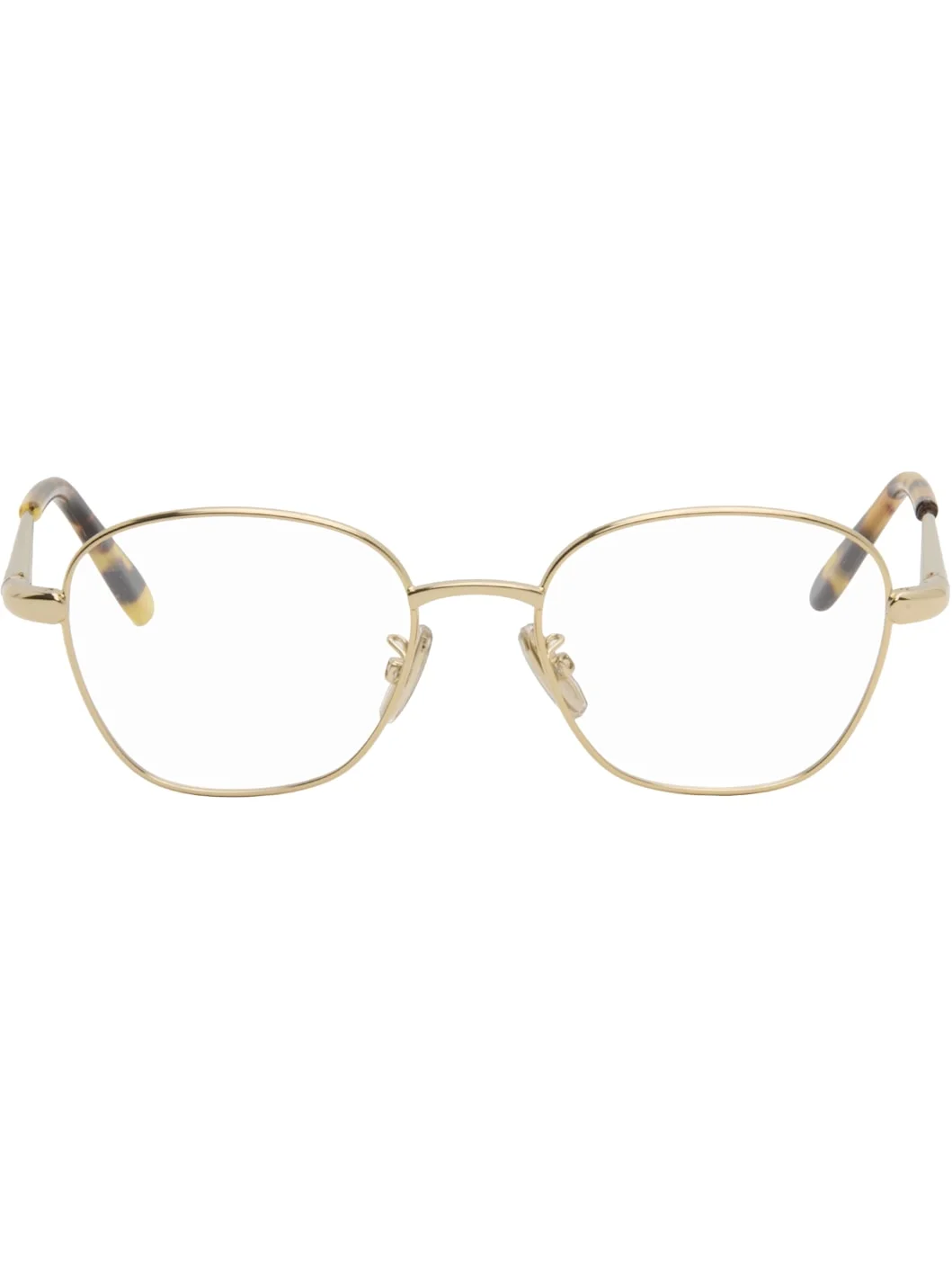 Round metal-frame optical glasses. · Adjustable rubber nose pads · Logo engraved at temples · Tortoiseshell acetate temple tips · Includes pouch · 50.18 145 Supplier color: Gold Metal, acetate. Made in Italy 252677M133000
