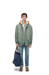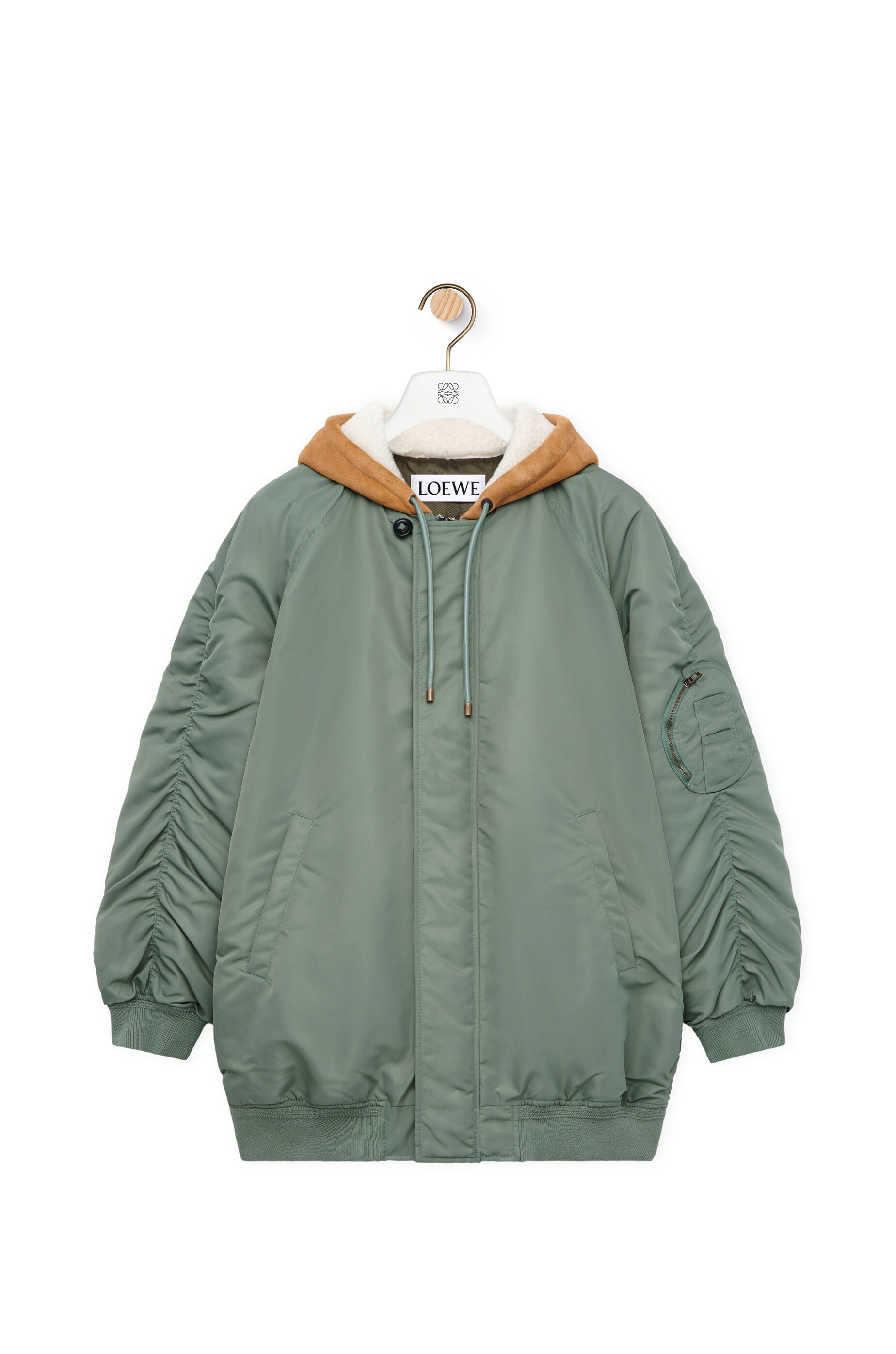 Hooded bomber jacket crafted in compact nylon twill. - Relaxed fit - Long length - Ruched construction - Contrast shearling hood with leather drawstring - Raglan sleeves - Ribbed knit cuffs and hem - Concealed snap button and zip front fastening - Snapped welt pockets - Zipped round utility pocket on the left sleeve - Fully lined - LOEWE Anagram embossed leather patch placed on the hood Details - Colour: Hunter Green - Main material: Polyamide - Weight: 1.3 kg - Model ID: H526Y01WBJ - Made in: Italy