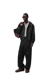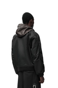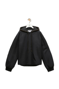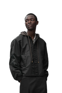 Jacket crafted in lightweight water-repellent compact nylon twill. - Relaxed fit - Regular length - Leather hood with drawstrings - Rib knit cuffs and back hem - Concealed zip front fastening with snap buttons - Diagonal welt pockets - Round utility pocket on the left sleeve - Inside welt pocket - Fully lined - LOEWE Anagram embossed leather patch placed on the hood Details - Colour : Black - Main material : Polyamide - Weight : 1.0 kg - Model ID : H526Y02W89 - Made in : Italy