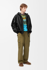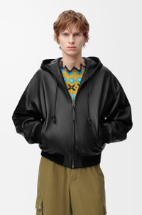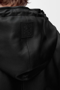Jacket in lightweight nappa lambskin featuring a hooded collar with a Flamenco-inspired drawstring. - Relaxed fit, regular length - Zip front fastening - Rib knit cuffs and hem - Zipped welt pockets, inside welt pocket - Fully lined - LOEWE Anagram embossed leather patch placed on the hood Colour: Black Main material: Nappa Weight: 1.5 kg Made in: Italy Materials & care Main Material: 100% lambskin