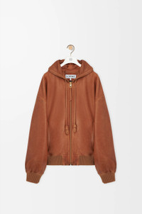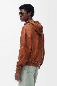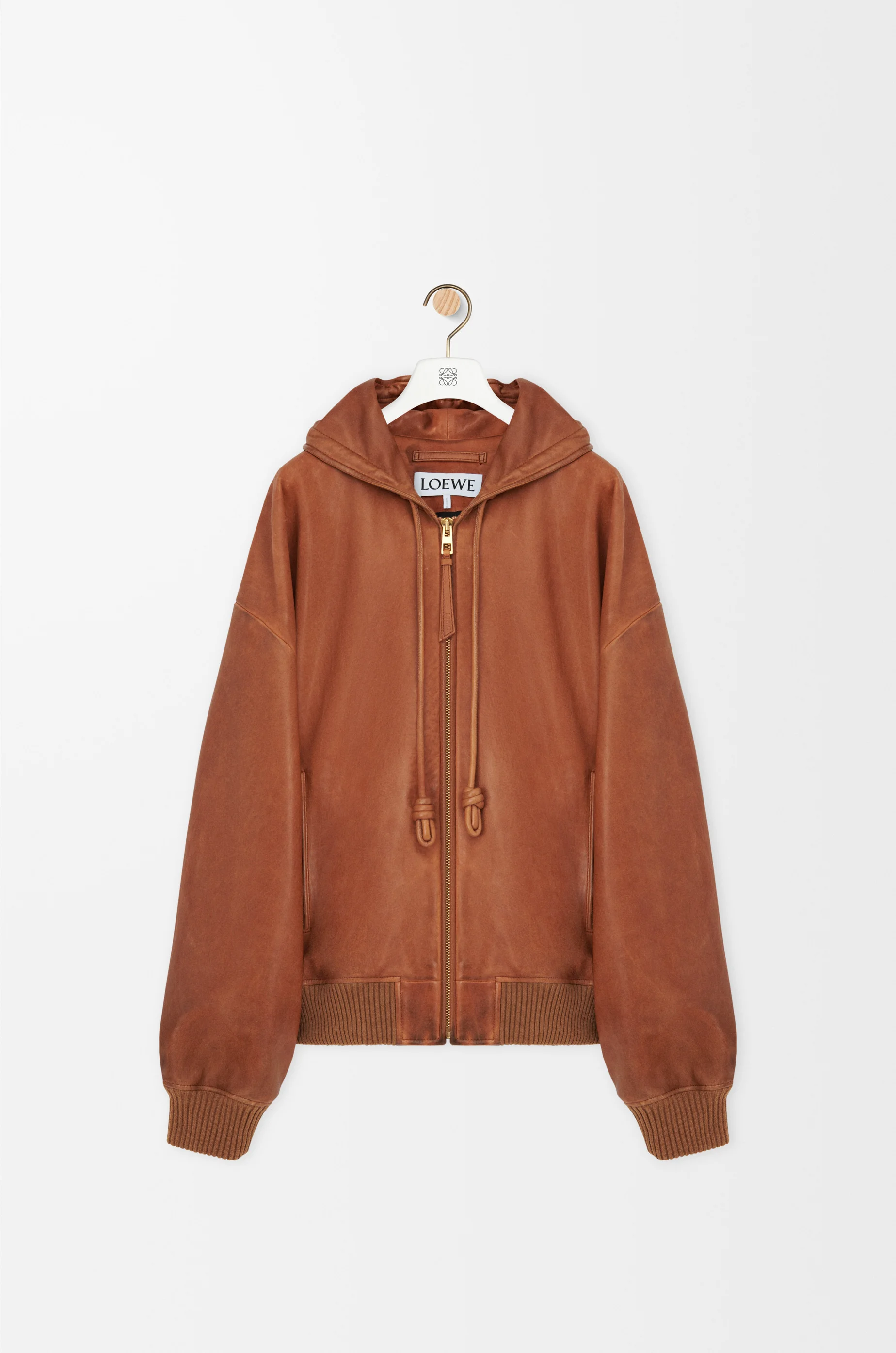Jacket in lightweight vintage-effect nappa lambskin featuring a hooded collar with a Flamenco-inspired drawstring. - Relaxed fit, regular length - Zip front fastening - Rib knit cuffs and hem - Zipped welt pockets, inside welt pocket - Fully lined - LOEWE Anagram embossed leather patch placed on the hood Colour: Tan Main material: Nappa Weight: 1.7 kg Made in: Italy Materials & care Main Material: 100% lambskin