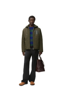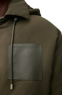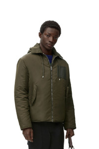 Jacket in compact nylon twill featuring a padded construction, a hooded collar with a leather drawstring and an adjustable drawstring hem. - Regular fit, regular length - Zip front fastening - Buttoned flap pockets, inside welt pocket with LOEWE Anagram embroidery - Fully lined - Anagram embossed leather chest patch pocket Details - Colour : Khaki Green - Main material : Polyamide - Weight : 1.0 kg - Model ID : H526Y02WAD - Made in : Portugal