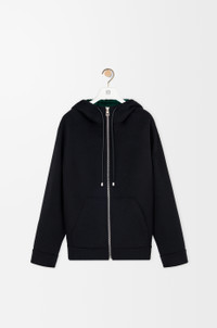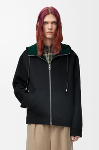 Jacket in lightweight bicolor wool and cashmere. - Regular fit, regular length - Hooded collar with leather drawstring - Zip front fastening - Kangaroo pockets - Adjustable tabs at the waist - LOEWE Anagram embossed leather patch placed on the hood Colour: Black/Green Main material: Virgin Wool/Cashemere Weight: 1.1 kg Made in: Italy Materials & care Main Material: 90% wool 10% cashmere