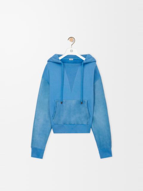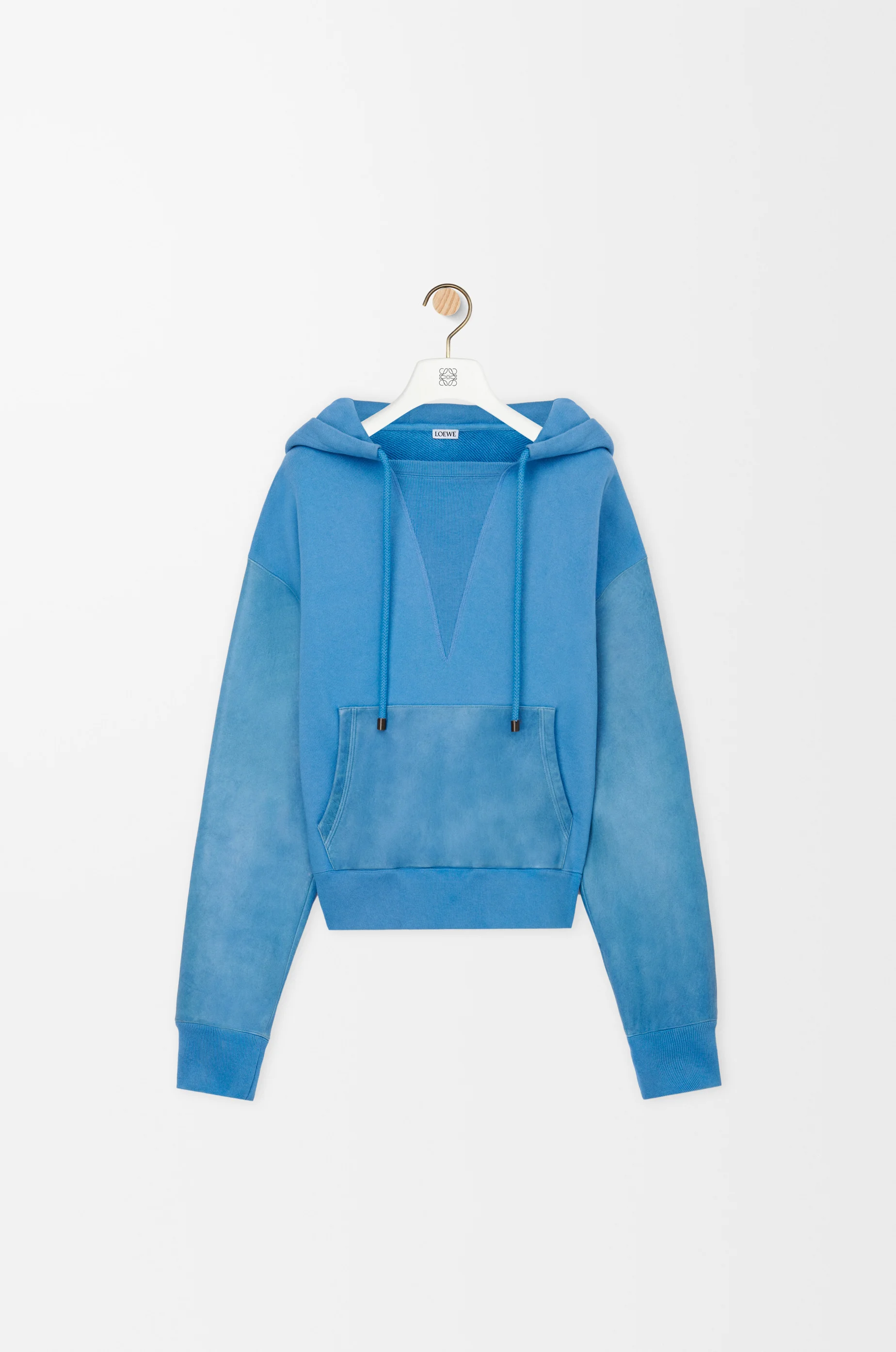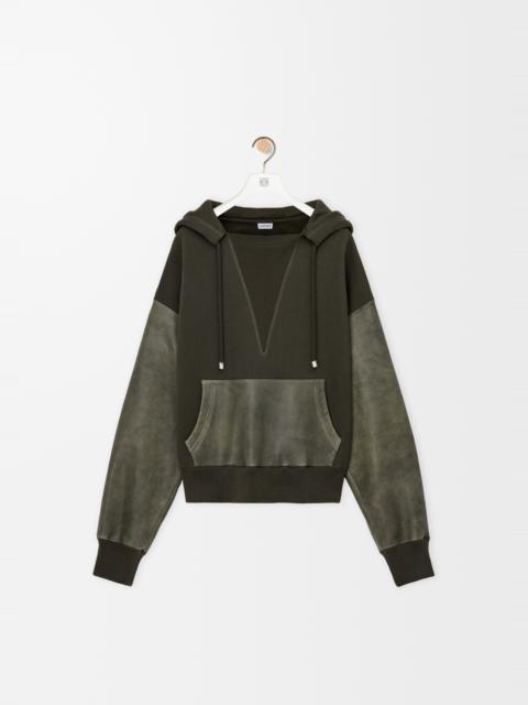 Hoodie in medium-weight cotton fleece and vintage-effect nappa lambskin with a one-of-a-kind finish featuring leather sleeves and kangaroo pocket. - Relaxed fit, regular length - Hooded collar with drawstring - Deep V ribbed insert at the front - Ribbed cuffs and hem - LOEWE Anagram embossed leather patch placed on the hood Colour: Blue Main material: Cotton/Nappa Weight: 1.2 kg Made in: Italy