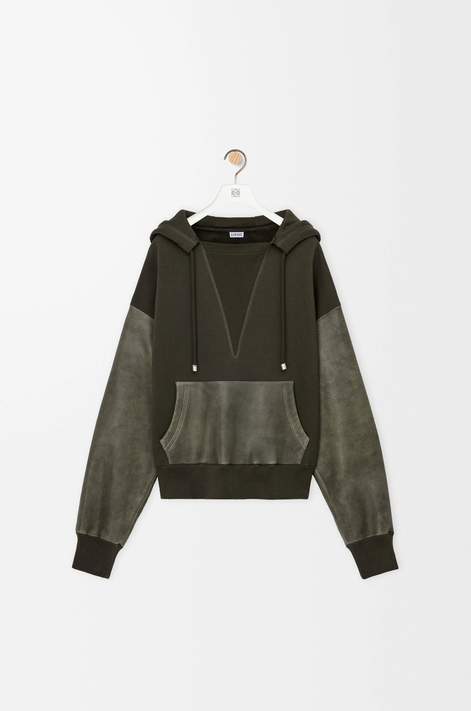 Hoodie in medium-weight cotton fleece and vintage-effect nappa lambskin with a one-of-a-kind finish featuring leather sleeves and kangaroo pocket. - Relaxed fit, regular length - Hooded collar with drawstring - Deep V ribbed insert at the front - Ribbed cuffs and hem - LOEWE Anagram embossed leather patch placed on the hood Colour: Khaki Green Main material: Cotton/Nappa Weight: 1.2 kg Made in: Italy