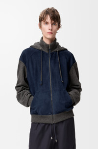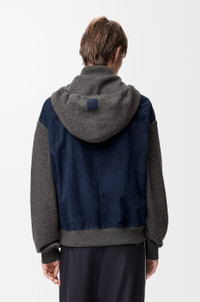 Hoodie in lightweight suede goatskin featuring a contrast knit hood and sleeves in medium-weight wool blend. - Relaxed fit, regular length - Zip front fastening with Puzzle puller - Kangaroo pockets - Unlined - LOEWE Anagram embossed leather patch placed on the hood Colour: Navy Blue Main material: Suede/wool Weight: 1.05 kg Made in: Italy Materials & care Main Material: 100% goat skin