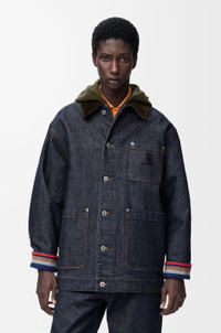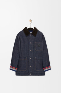 Jacket in medium-weight double face cotton denim featuring a corduroy collar and a striped brushed cotton lining. - Relaxed fit, regular length - Button front fastening, buttoned cuffs - Chest patch pocket, patch pockets, inside Anagram leather patch pocket - Adjustable waist tabs - LOEWE Anagram embossed leather patch placed on the chest pocket Colour: Raw Denim/Blue Main material: Cotton Weight: 1.41 kg Made in: Italy Materials & care Main Material: 100% cotton